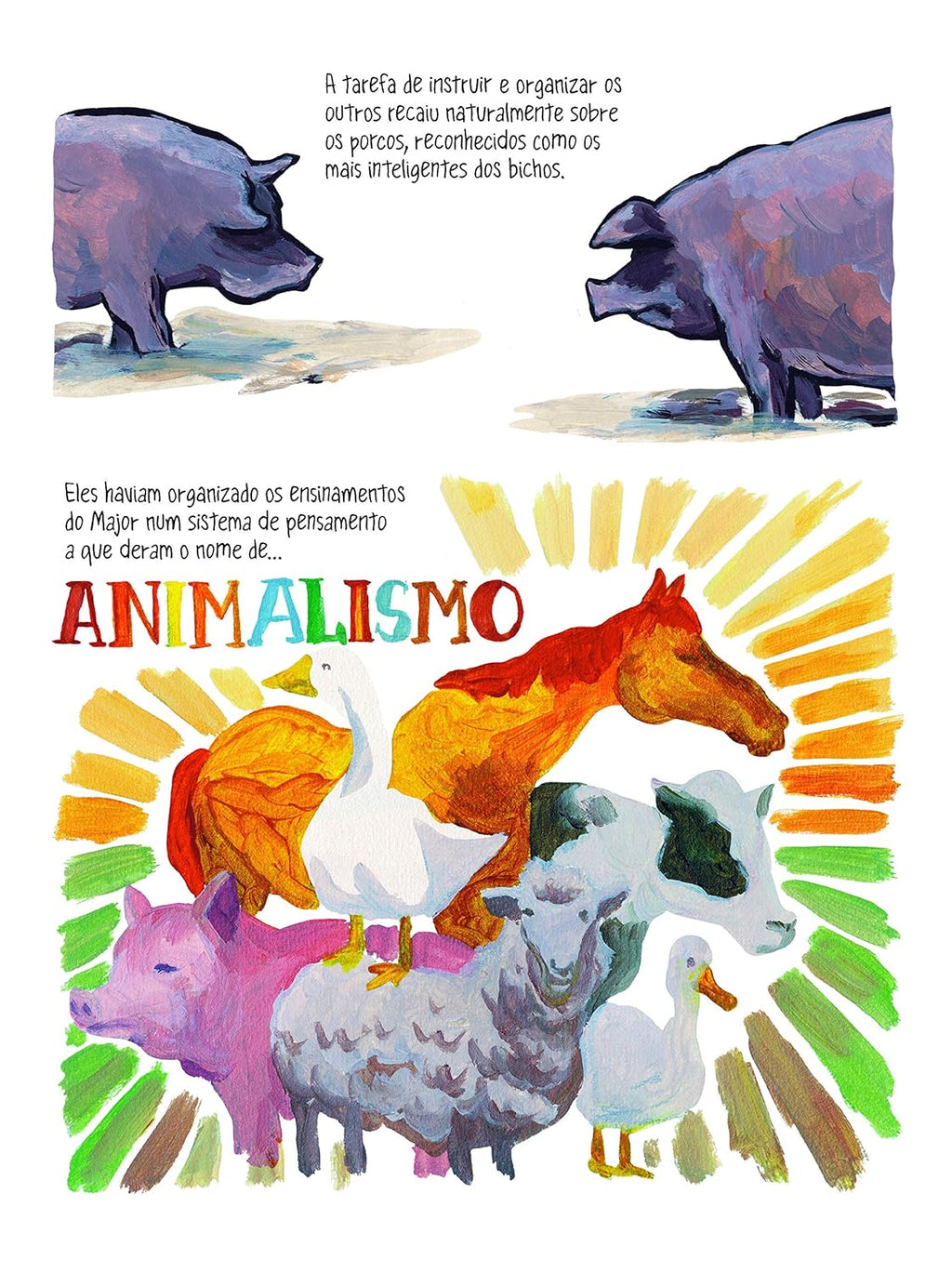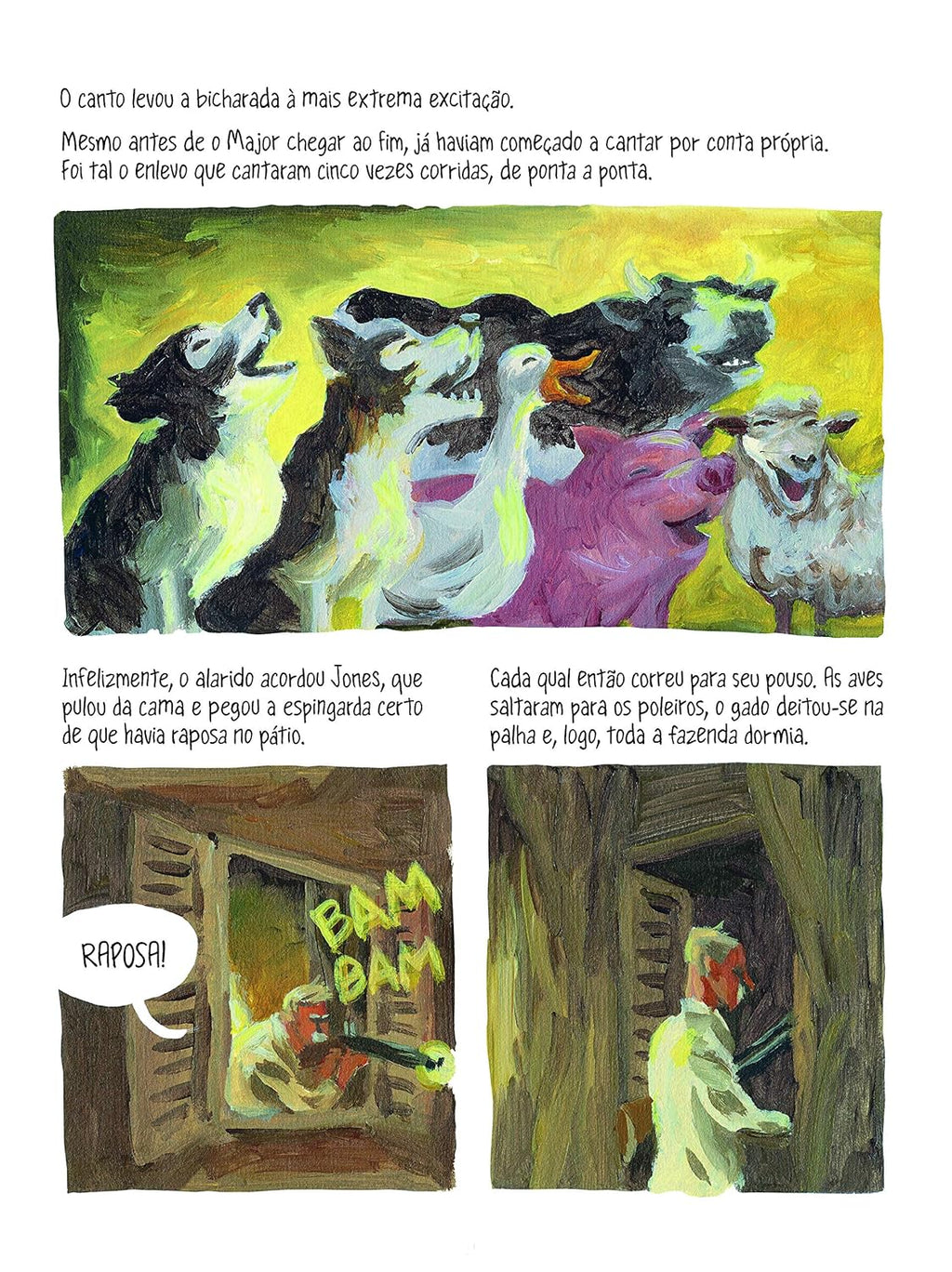 Odyr passou os últimos anos envolvido numa empreitada desafiadora: transformar em quadrinhos um dos maiores clássicos da literatura mundial, A revolução dos bichos . Em tinta acrílica, fazendo com que cada página se tornasse uma verdadeira obra de arte, Odyr deu forma à narrativa de George Orwell ― e a personagens antológicos como os porcos Napoleão e Bola-de-Neve. Escrita em plena Segunda Guerra Mundial e publicada em 1945, essa breve narrativa causou desconforto ao satirizar ferozmente a ditadura stalinista numa época em que os soviéticos ainda eram aliados do Ocidente na luta contra o eixo nazifascista. Mas não só. Mais de sessenta anos depois, A revolução dos bichos se tornou uma alegoria universal sobre as fraquezas humanas que levam à corrosão de grandes ideias e projetos de revolução política.