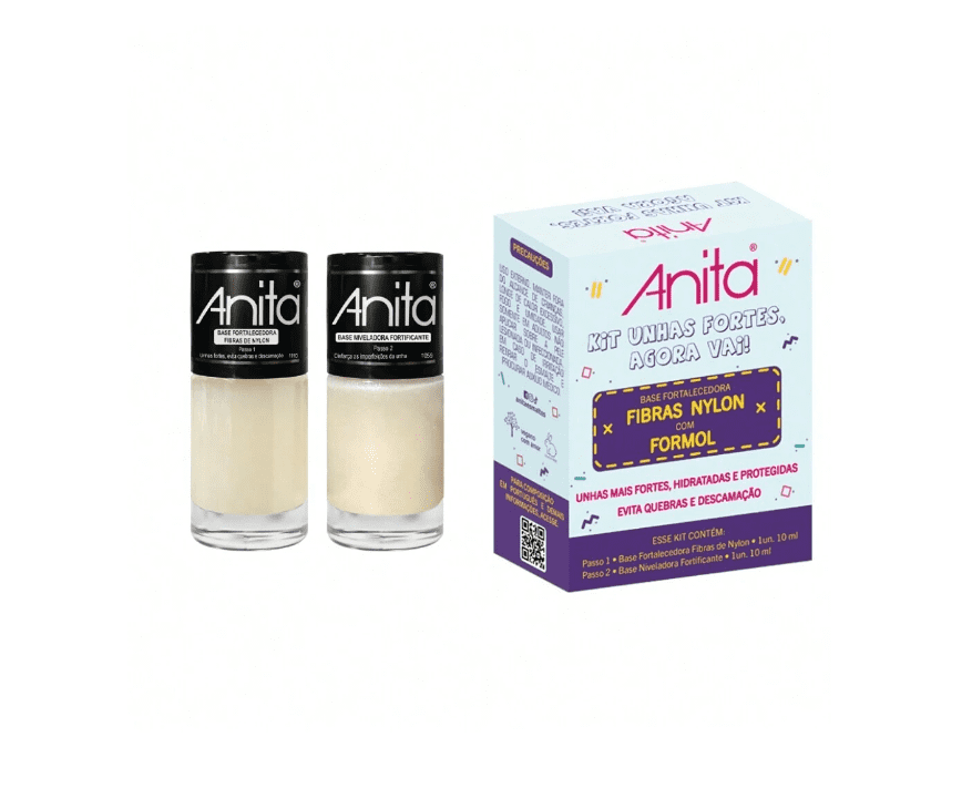 Kit 2 Esmaltes de tratamento Anita Unhas Fortes Agora vai!Esse kit contém:Base fortalecedora fortalecedora fibras de nylon (-unhas fortes, evita quebra e descamação.Base Niveladora Fortificantes -disfarça as imperfeições da unha.
