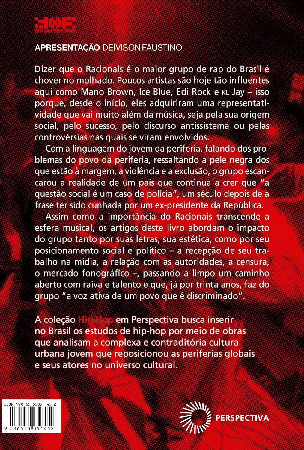 Talvez o grupo mais importante e influente da música brasileira dos últimos 35 anos, o Racionais explode no cenário cultural ao falar diretamente com os jovens das periferias das grandes cidades brasileiras, com temas de grande impacto social, como violência policial, discriminação social e racial, autoestima e desenvolvimento pessoal e ascensão social. Neste livro, a trajetória do grupo e sua obra são analisadas por estudiosos, revelando sua dimensão transformadora na sociedade brasileira contemporânea.
